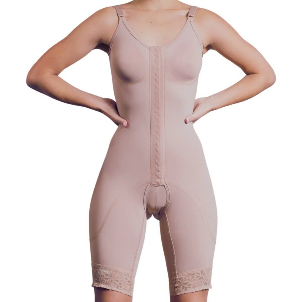 Cinta modeladora pós cirúrgica, com busto pré moldado, alças finas, tecido com dupla camada, possui duas regulagens de colchetes de aço, viés próprio de tecido macio nas axilas e entre pernas, proporcionando maior conforto, abertura para ir ao banheiro sem precisar tirar a cinta, as costuras são externas para não marcar o corpo nem causar desconforto, acabamento em renda nas pernas para não enrolar nem apertar.